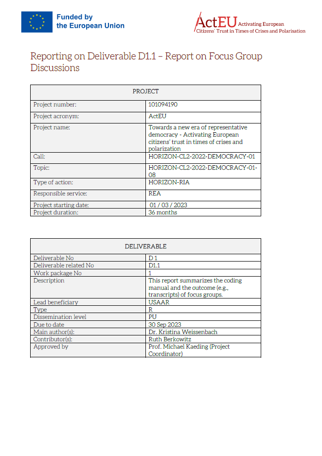 This report shows the design of the focus groups, as part of the exploratory sequential design of the ActEU project. Initial findings on the patterns relating to political participation, emotional and rational aspects, representation and attitudes are presented. It also provides insights into how the focus group data was used to further develop the survey and web scraping.