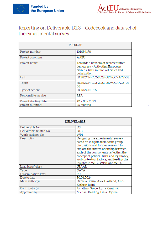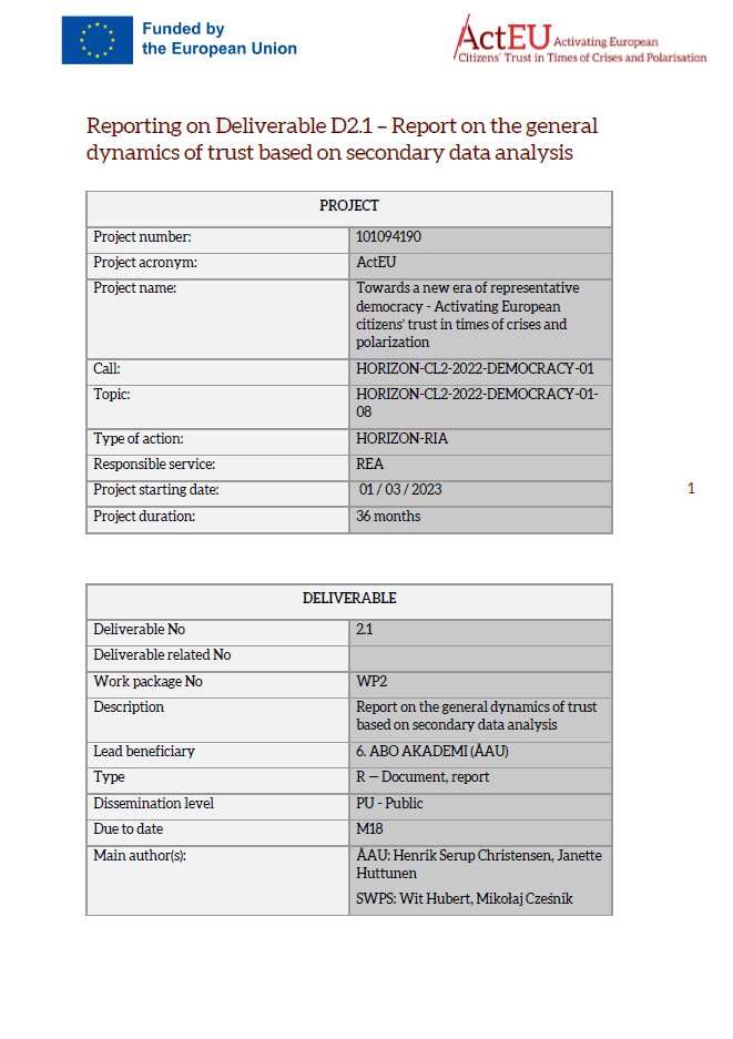 The ActEU project („Activating European Citizens‘ Trust in Times of Crises and Polarisation“) has as one of its main missions to map and investigate persistent problems of declining political trust, legitimacy and representation in Europe. Within the overall project, work package 2 focuses on achieving a better understanding of the nature of these problems by examining citizens‘ political attitudes. This report provides a comprehensive and systematic overview of the nature, extent and evolution of the crisis of political trust throughout the European Union (EU) and the United Kingdom (UK) since the